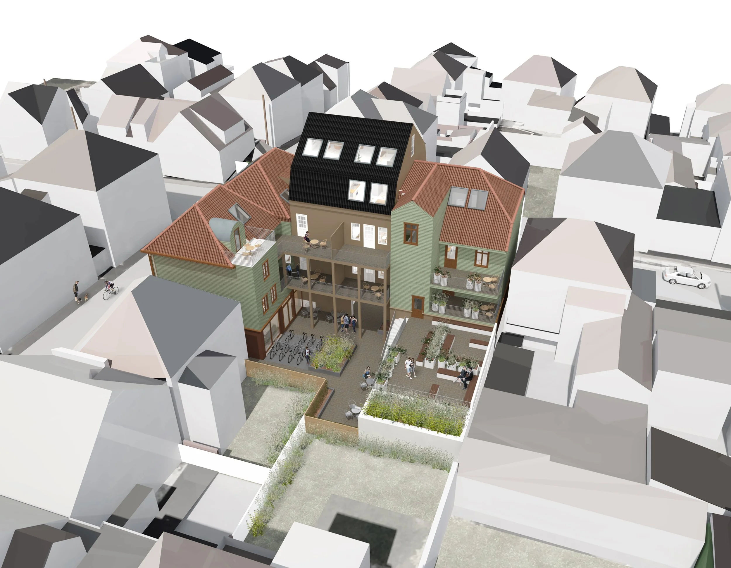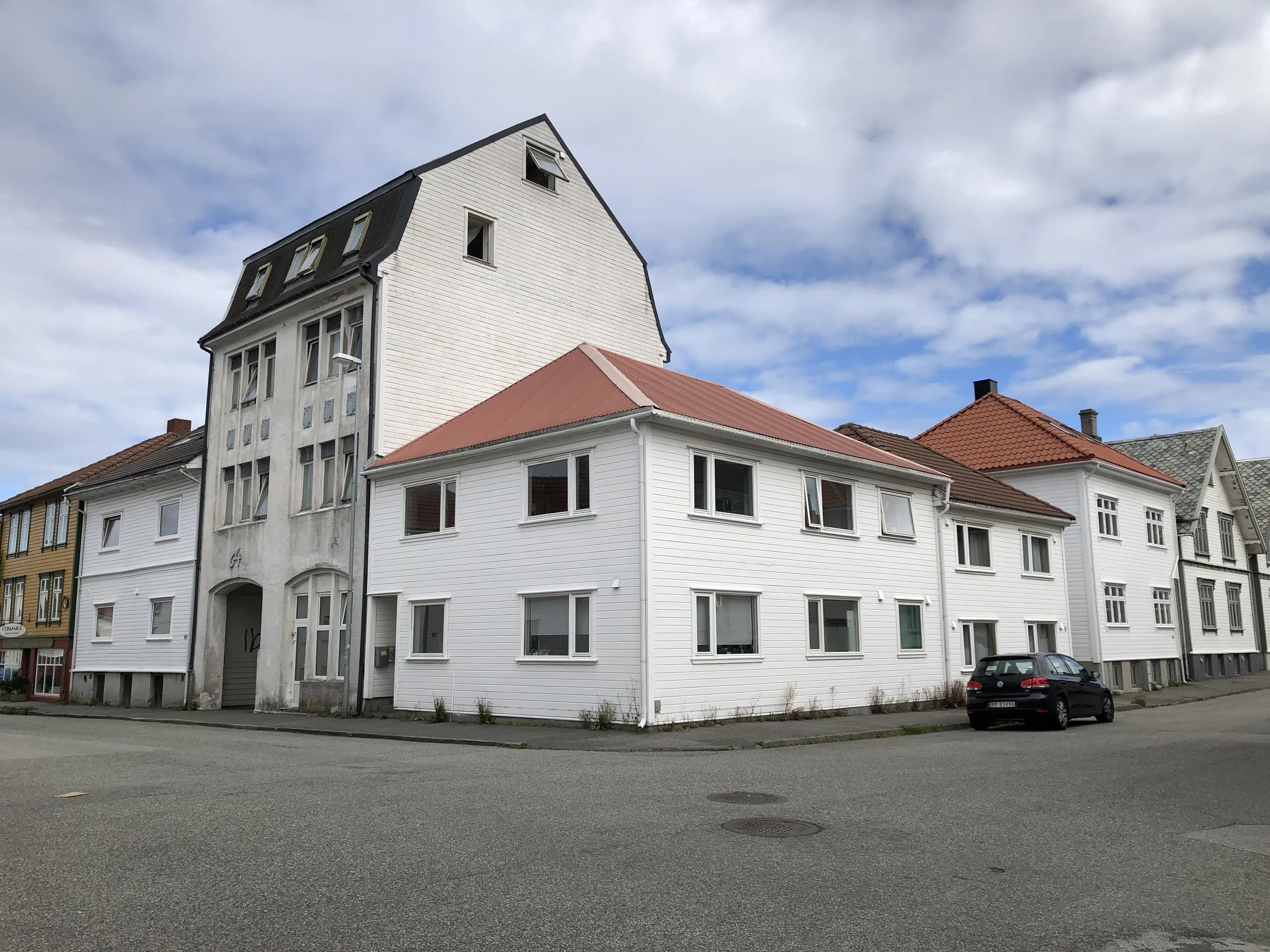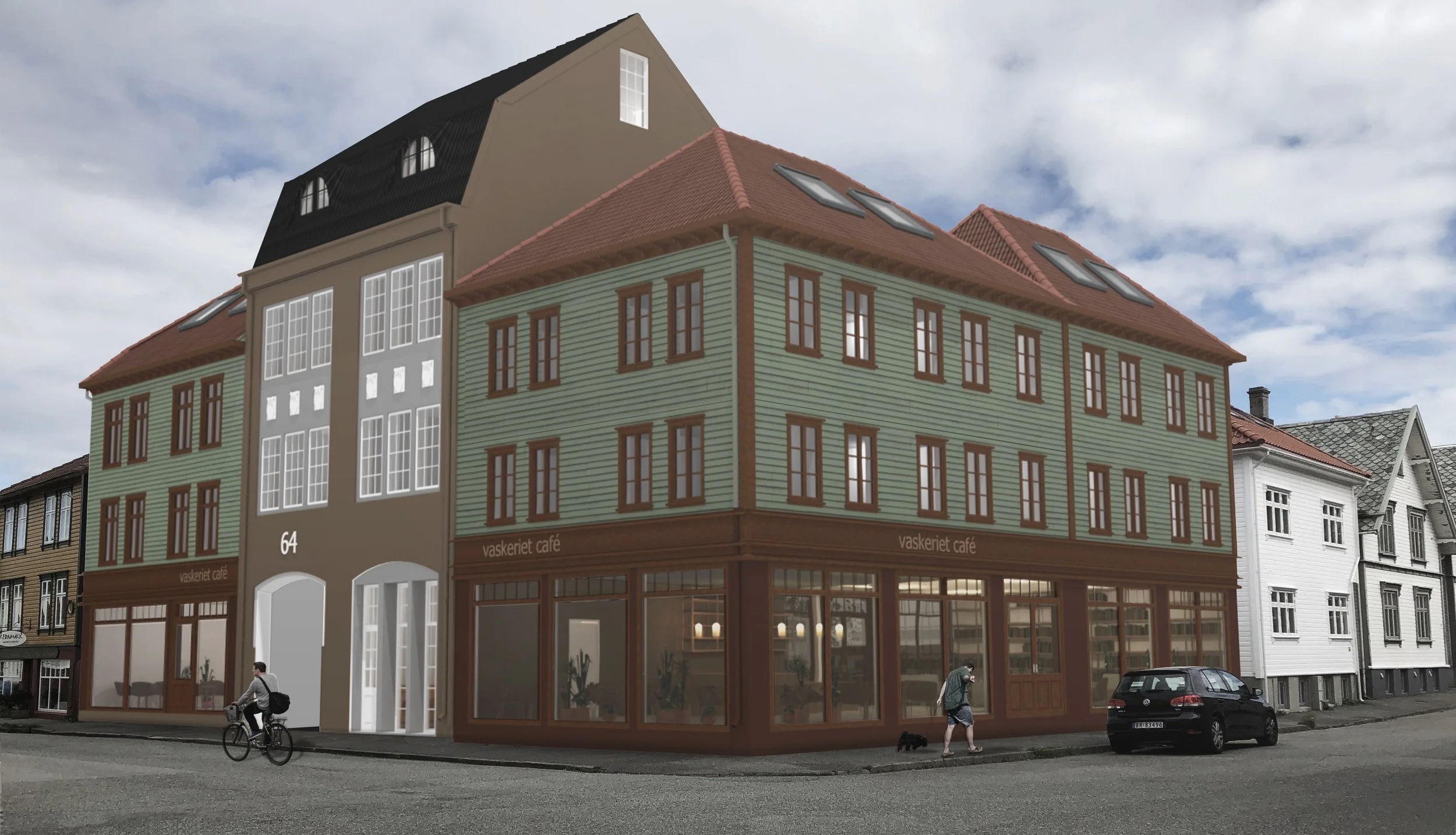 Renovation of 19th century wooden houses and a early 20th century Art Noveau building that used to house a print shop for the local canned fish industry, Vestlandske Lithografiske Kunstanstalt. Transformed to student housing with laundry and café on the ground floor.